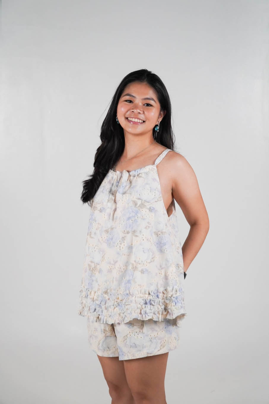 A sweet and easy favorite, this top is designed with adjustable straps that connect neatly at the neckline—giving you comfort, security, and confidence with every wear. The hem is finished with delicate gathers for a playful yet flattering touch, making it the perfect piece to dress up or down.