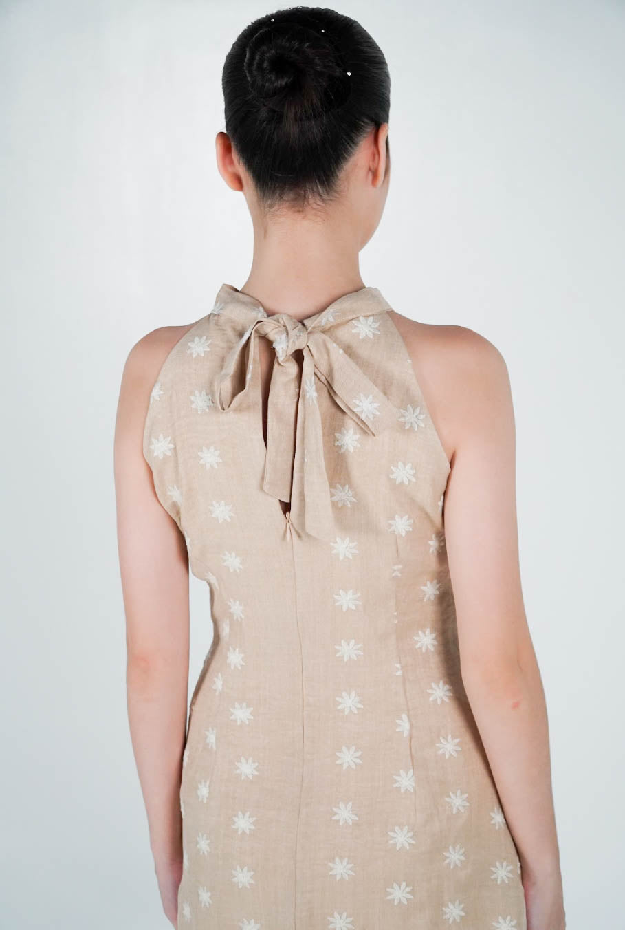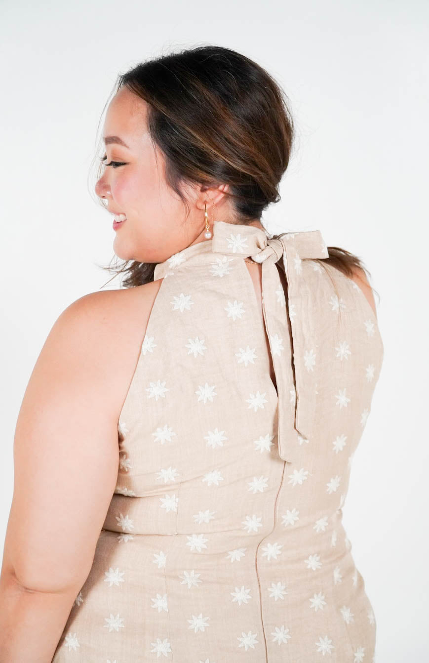 Designed with a halter neckline and adjustable back neck tie for a custom fit
