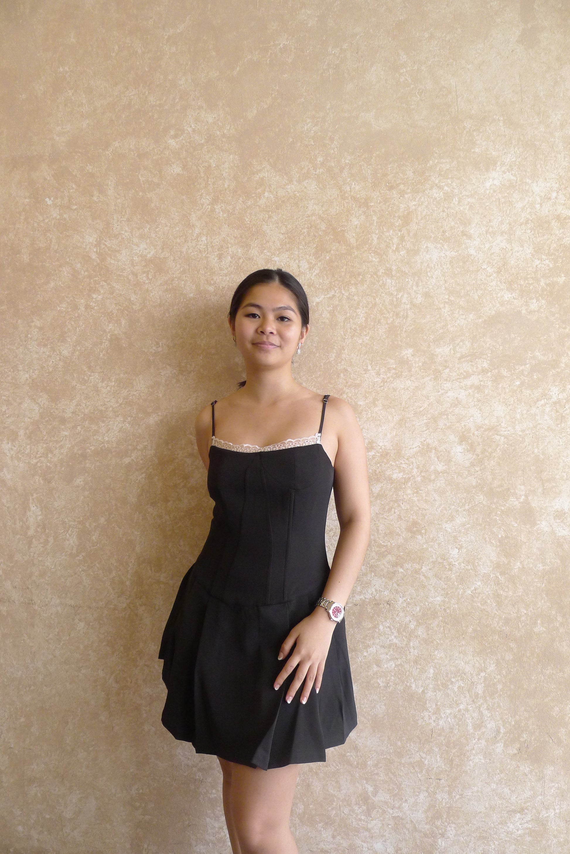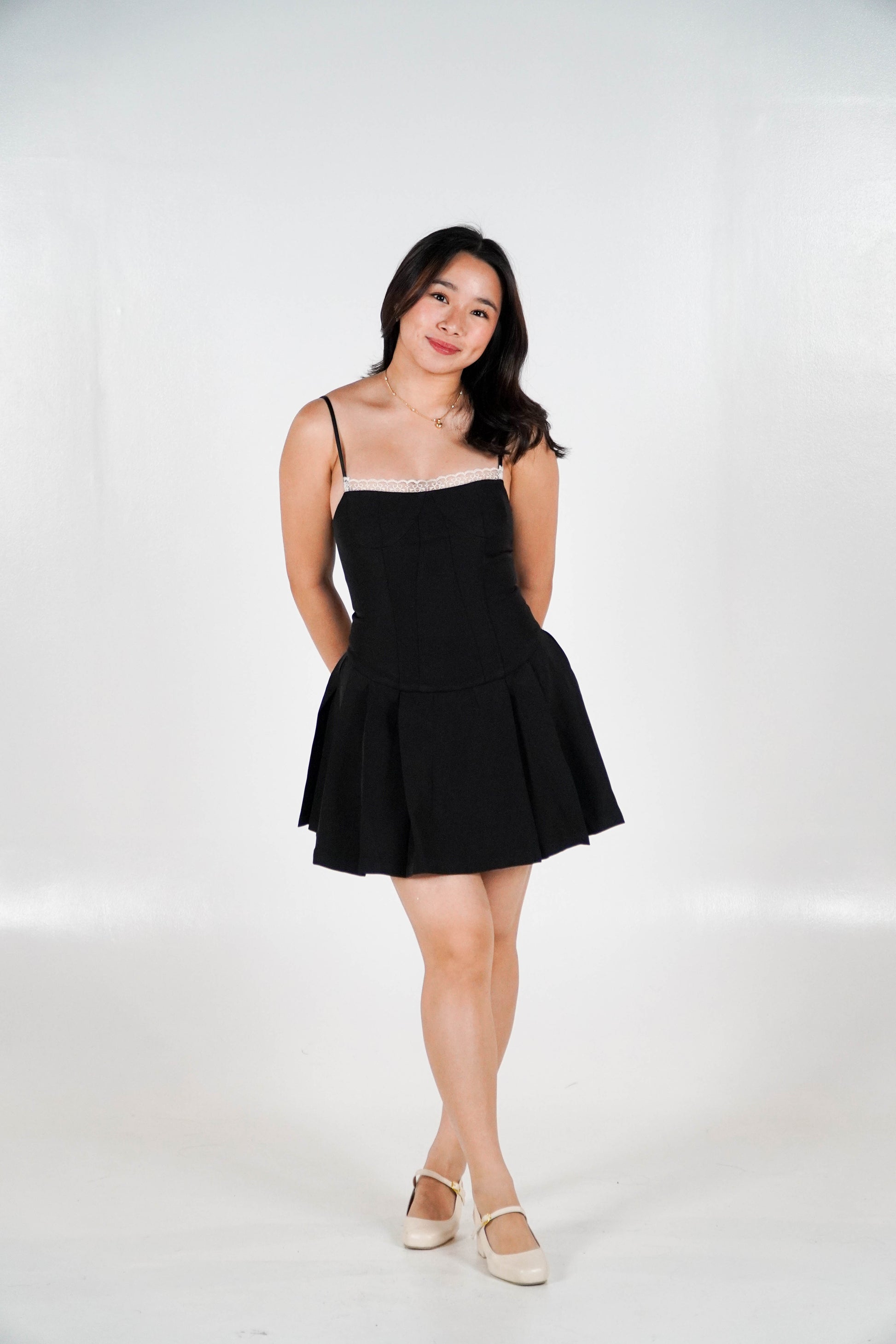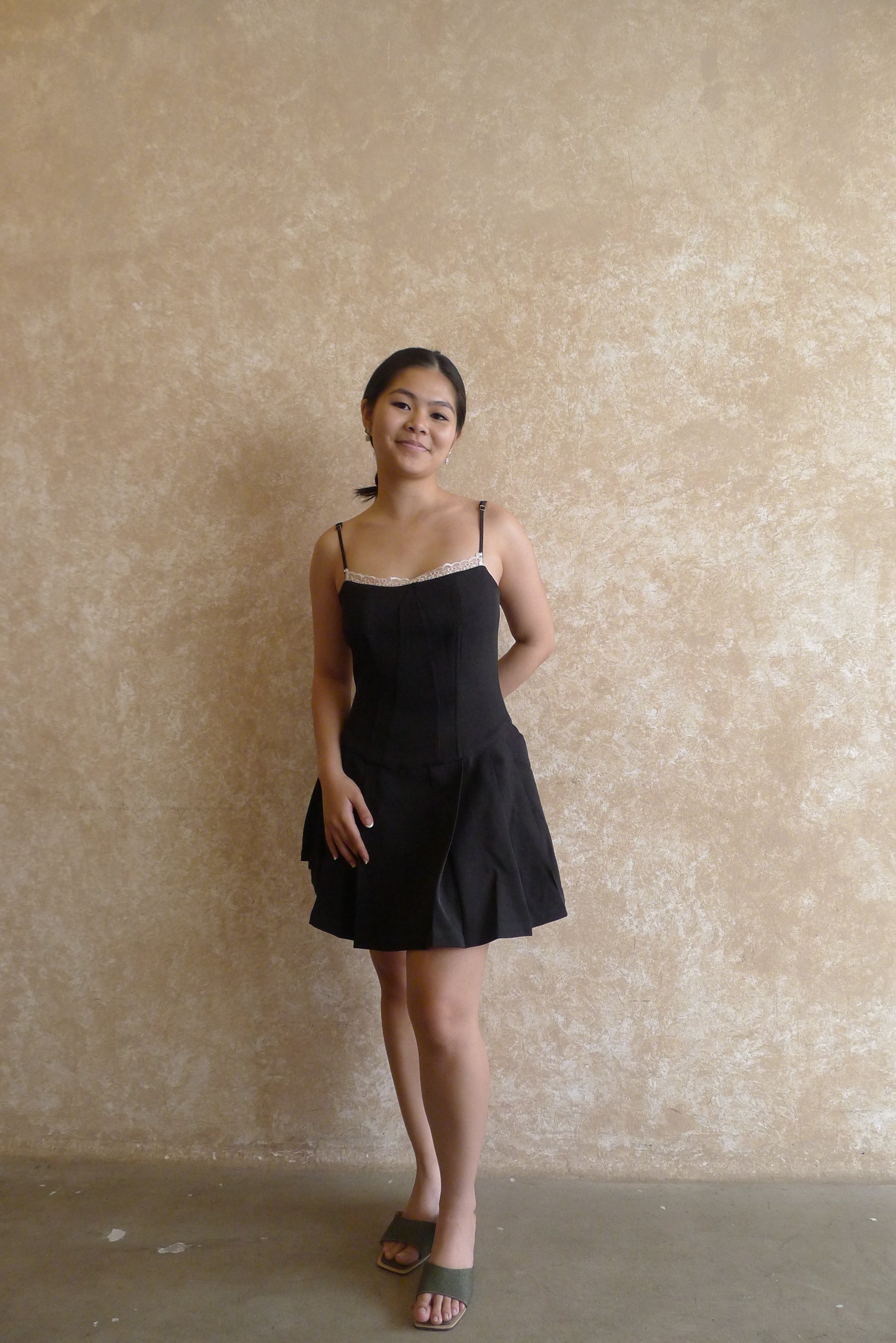 An adjustable spaghetti-strapped mini dress with a low yet demure neckline, finished with timeless lace