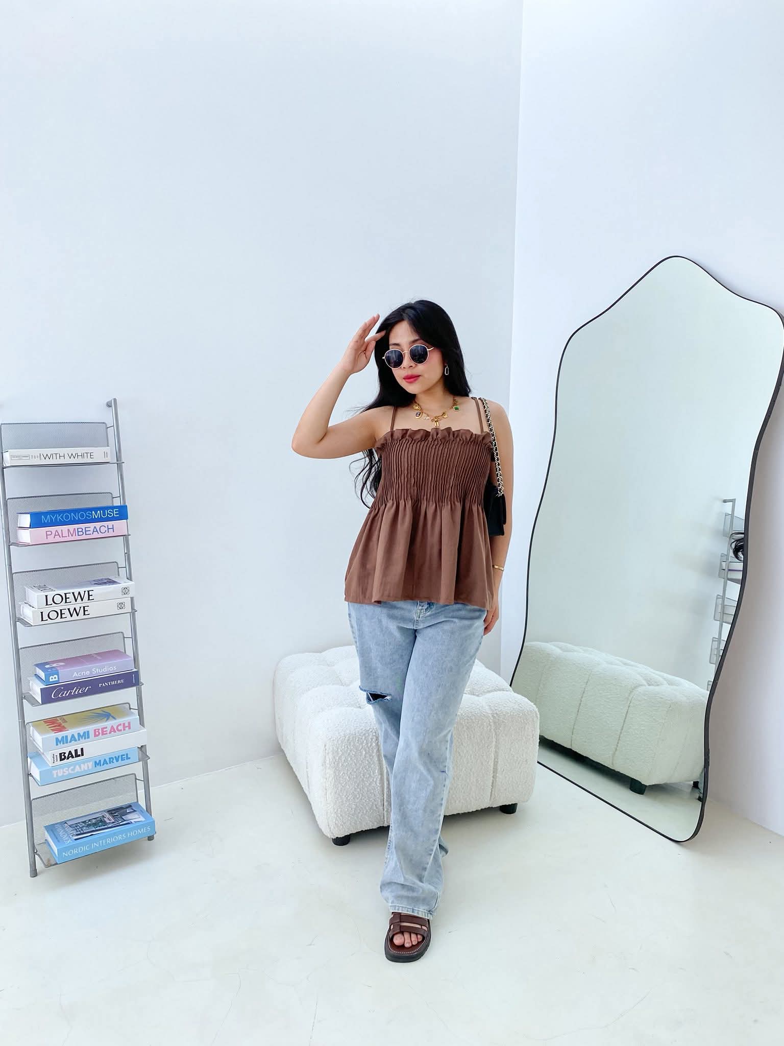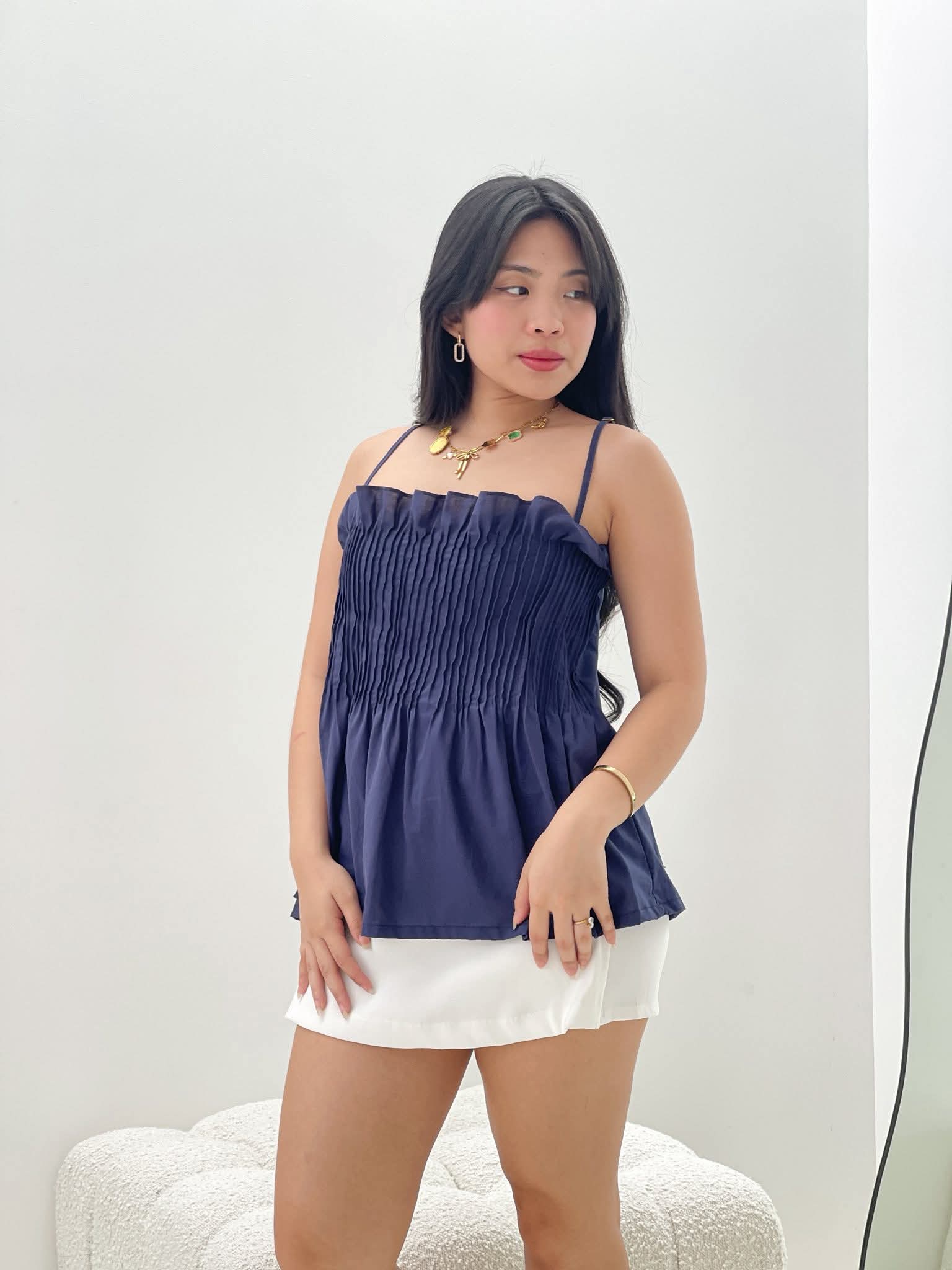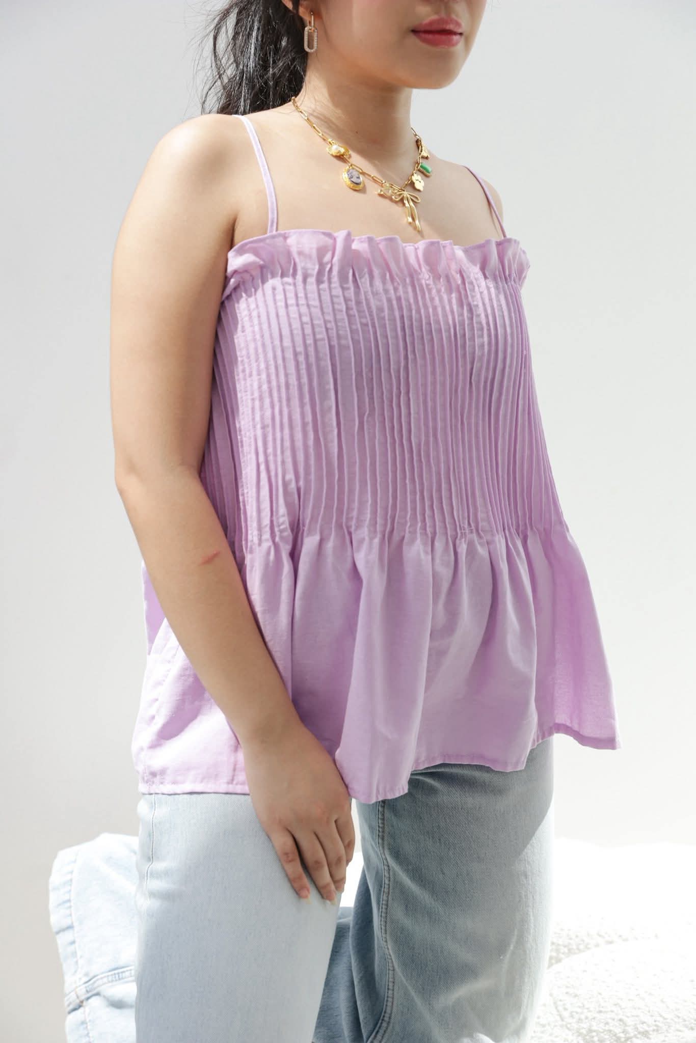 - A stylish spaghetti-strapped top featuring exquisite pleats for a touch of elegance.