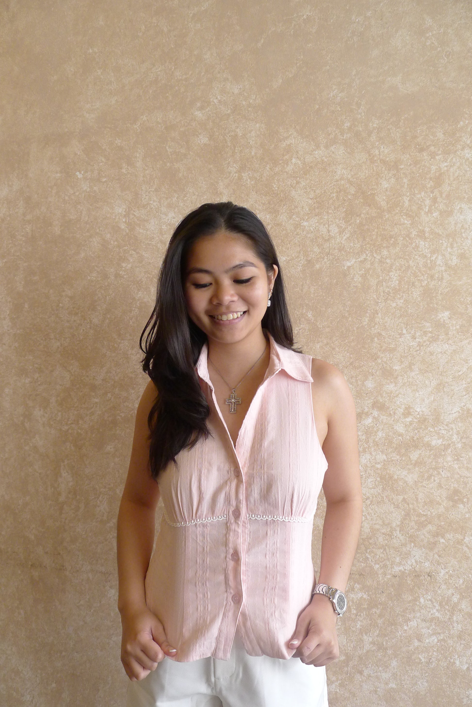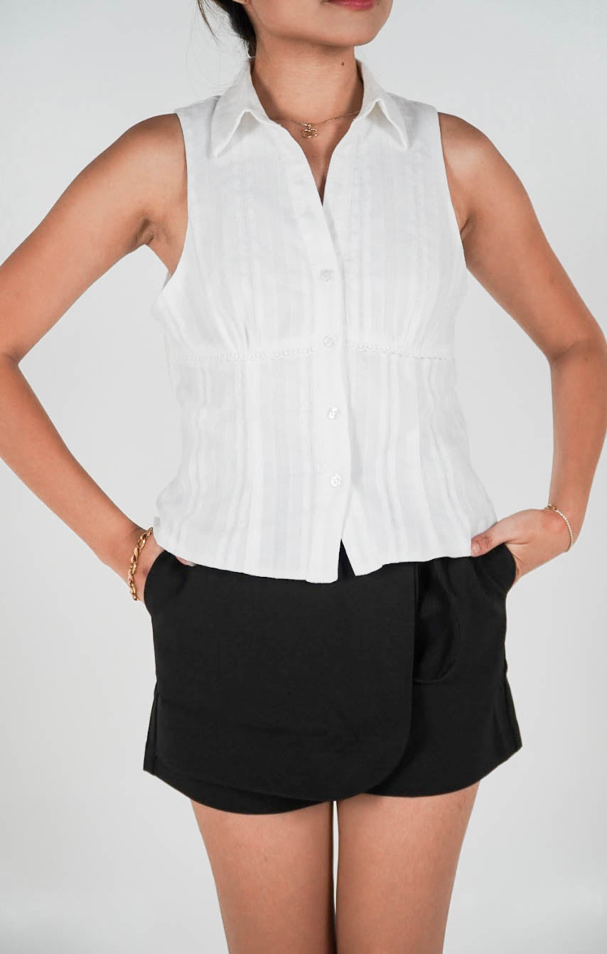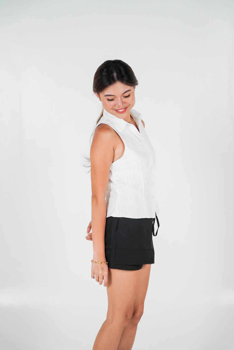 A sleek button-down top with a low yet conservative V-neckline