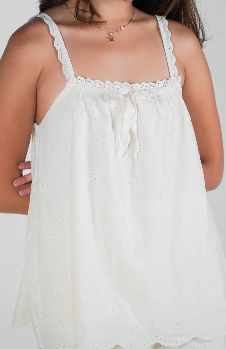 - Crafted from breathable cotton eyelet fabric with an intricate pattern, it’s the perfect balance of style and comfort.